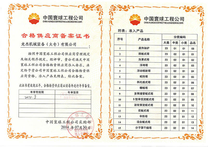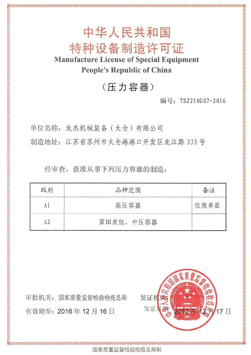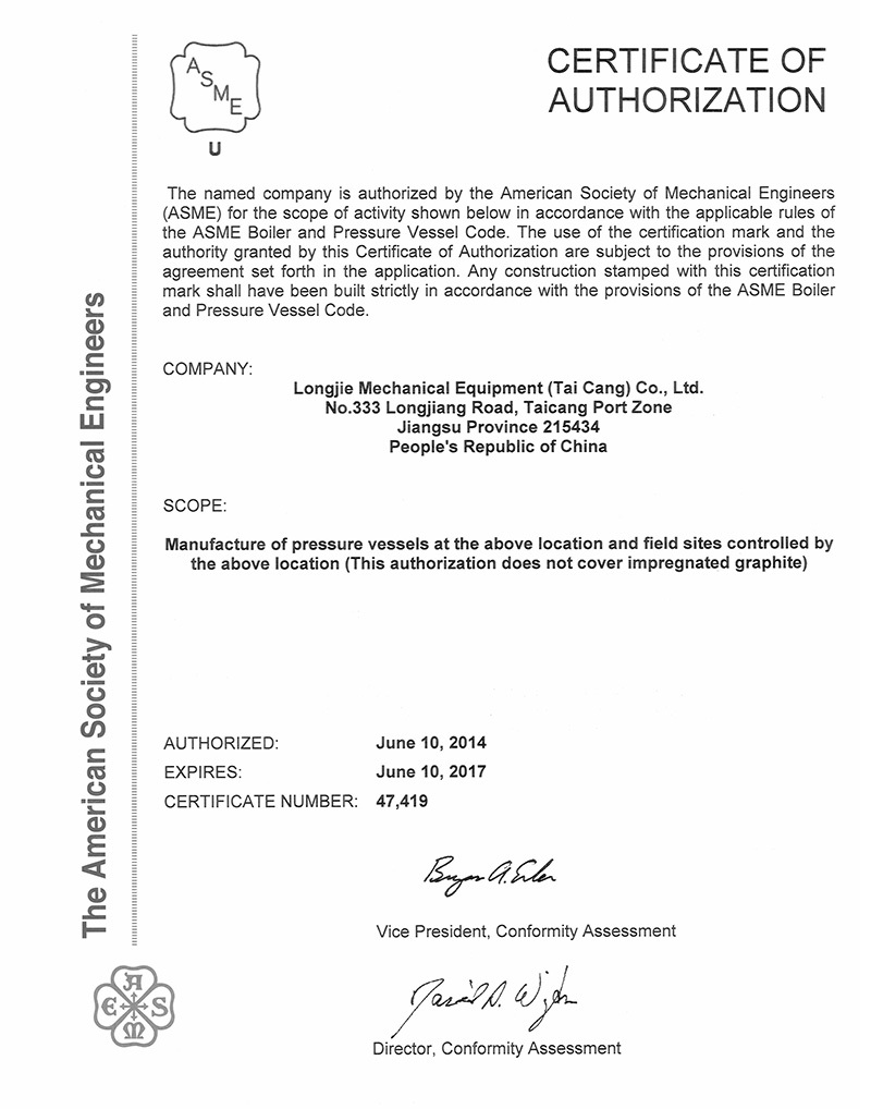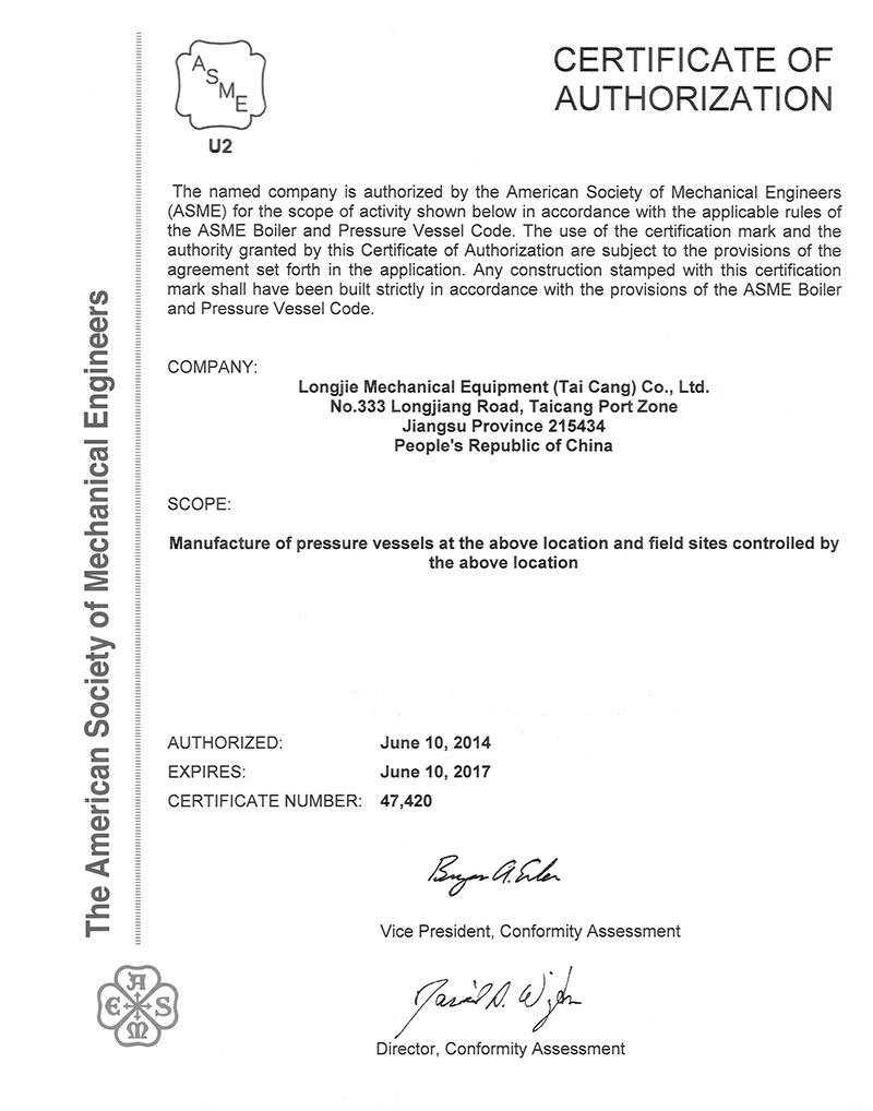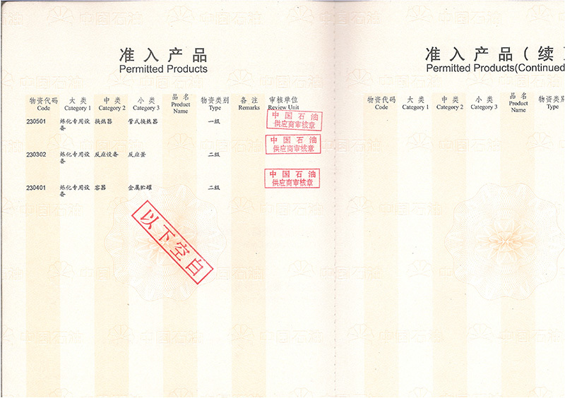 公司具有中國高、中低壓壓力容器生產許可證(A1級, 包含設計、制造),ASME U、U2鋼印證書,PED G模式生產資格,是中石化、中石油、中海油、中化集團、國家能源集團等大型知名企業的合格供應商。